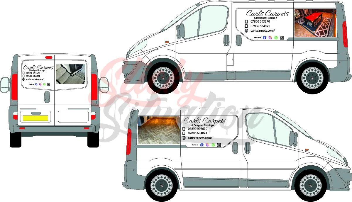 **Picture for illustration purposes only, please use the Van Size selection below to select the correct wheelbase that matches your vehicle** Sign Coverage: Front, Both Sides & Rear. (All Design Work is carried out once order has been placed.) All designs are carried out on scaled template with design visual sent for customer approval before the kit is manufactured & sent. Amendments to the design as required are included, until 100% happy. If unsure on what size to order please contact us In an unlikely event the design visual does not meet your requirements, a full refund will be issued less a design fee of £35.